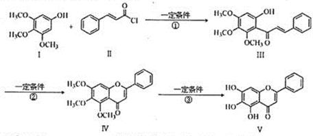 4、填空题 化合物V是中药黄芩中的主要活性成分之一,具有抗氧化和抗肿瘤作用。化合物V也可通过下图所示方法合成: