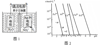 (4)通过控制溶液的pH对工业废水中的金属离子进行分离。图2是某些金属氢氧化物在不同浓度和pH时的沉淀——溶解图像,图中直线上的点表示平衡状态。当溶液中的离子浓度小于1×10-5 mol·L-1时,认为该离子沉淀完全。 ①Fe (OH)3、Al(OH)3、Cr(OH)3三种物质的溶度积常数最大的是 , 图中A、B、C三点中表示Fe(OH)3的沉淀速率大于溶解速率的是 。 ②由图可得Fe(OH)2的溶度积的值为 。
