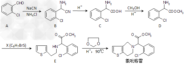 3、填空题  近年来,我国部分地区相继发现一些以发热伴血小板减少为主要表现的感染性疾病病例。氯吡格雷(clopidogrel,1)是一种用于抑制血小板聚集的药物,根据原料的不同,该药物的合成路线通常有两条,其中一种合成路线如下