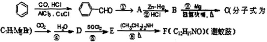 4、填空题 (10分)避蚊胺(F,分子式C12H17NO)是一种驱虫药,对蚊虫有很强的驱避作用。据报道,避蚊胺的驱避效能是产生了其对蚊虫感觉器的阻塞作用,对人畜无毒,使用安全。F可由下述方法合成:
