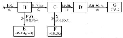 试题分析:有机物A是由C、H、O三种元素组成的五元环状化合物,其相对分子质量为98,其核磁共振氢谱只有1个峰,且由G的分子式可知,A中有4个C原子,根据A的相对分子质量,利用穷举法判断A的分子式只能是C4H2O3,该分子中含有2个酯基,1个碳碳双键的环状化合物,所以A中不含氧的官能团的名称是碳碳双键;B能与氢气发生加成反应,说明B中仍存在碳碳双键,所以A到B发生酯的水解反应,B加氢后生成C,则C为1,4-丁二酸,D为1,4-丁二醇,G为1,3-丁二烯,X为乙醇,与C发生酯化反应生成F,B中的碳碳双