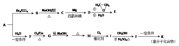 2、填空题  (15分)烃A是一种重要的基本化工原料,用质谱法测得其相对分子质量为28。下图是以A为原料合成药物中间体E和树脂K的路线。