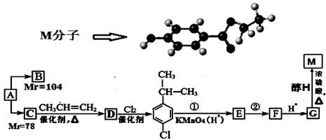 3、填空题 (14分)某相对分子质量为26的烃A,是一种重要的有机化工原料,以A为原料在不同的反应条件下可以转化为烃B、烃C。B、C的核磁共振氢谱显示都只有一种氢,B分子中碳碳键的键长有两种。以C为原料通过下列方案可以制备具有光谱高效食品防腐作用的有机物M,M分子的球棍模型如下图所示。