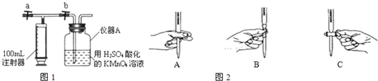 ①如图所示,打开a,关闭b,用注射器抽取100mL新装修的室内空气.关闭a,打开b,再缓缓推动注射器,将气体全部推入酸性高锰酸钾溶液(25.00mL1.00×10-3mol?L-1)中,使其充分吸收.再如此重复几次.