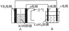 1、选择题 碱性硼化钒(VB2)—空气电池工作时反应为:4VB2 + 11O2 = 4B2O3 + 2V2O5。用该电池为电源,选用惰性电极电解硫酸铜溶液,实验装置如图所示。当外电路中通过0.04mol电子时,B装置内共收集到0.448L气体(标准状况),则下列说法正确的是