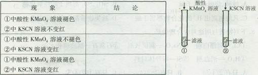 1、填空题  (3分)某同学为了检验家中的一瓶补铁药(成分为FeS04)是否变质,设计了如下实验:将药片除去糖衣研细后,溶解过滤,取滤液分别加入两支试管中,再进行如下图所示操作。?请填出该同学实验中出现以下现象时所应得到的结论: