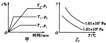 2、选择题 在一定条件下某体积一定的密闭容器中发生的反应aA(g)+bB(g)xC(g)符合下图甲所示关系(c%表示平衡混合气体中C的百分含量,T表示温度,p表示压强)。则图乙中纵轴y是指