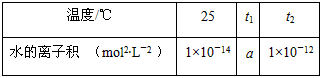 (1)若25<t1<t2,则a________1×10-14 (填“>”、“<”或“=”),作此判断的理由是________________________。