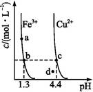 本题解析:b、c两点金属阳离子的浓度相等,都设为x,设该温度为室温,则c(OH-)c=10-9.6 mol·L-1,c(OH-)b=10-12.7 mol·L-1,则Ksp[Fe(OH)3]=x×(10-12.7)3,Ksp[Cu(OH)2]=x×(10-9.6)2,故Ksp[Fe(OH)3]<Ksp[Cu(OH)2],A正确;a点到b点的碱性增强,而NH4Cl溶解于水后显酸性,故B错