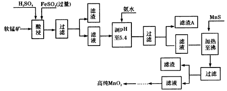 4、填空题 二氧化锰是制造锌锰干电池的基本原料,普通锌锰干电池的电池反应式为:2MnO2+Zn+2H2O=2MnOOH+Zn(OH)2。工业上以软锰矿为原料,利用硫酸亚铁制备高纯度二氧化锰的流程如下(软锰矿中所有金属元素在酸性条件下均以阳离子形式存在)