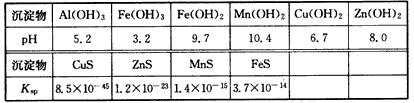 某软锰矿的主要成分为MnO2,还含Si(16. 27%)、Fe(5. 86%)、Al(3. 24%)、Zn (2.68%)和Cu(0. 86%)等元素的化合物。部分阳离子以氢氧化物形式完全沉淀时,溶液的pH及部分硫化物的Ksp(均为25℃时)见下表,回答下列问题