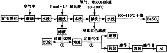 2、填空题 重晶石矿石主要含有BaSO4,还含有少量有SiO2、Al2O3、Fe2O3、MnO2、FeS2、Na2O、K2O等杂质。以下是某工业制备硫酸钡以及分离某些金属的流程图。