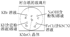 3、填空题 化学实验的微型化可有效地减少污染,实现化学实验绿色化的要求。某学生按下列操作做一个实验:在一块下衬白纸的玻璃片的不同位置分别滴加浓度为0.1 mol/L的KBr、KI(含淀粉溶液)、NaOH(含酚酞)、FeCl2(含KSCN)溶液各1滴,每种液滴彼此分开,围成半径小于表面皿的圆形(如下图所示),在圆心处放置2粒芝麻粒大小的KMnO4晶体,向KMnO4晶体滴加一滴浓盐酸,再立即将表面皿盖好。(e处反应的化学方程式为:2KMnO4+16HCl===2MnCl2+5Cl2↑+8H2O)