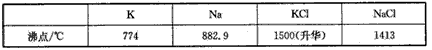 2、选择题 金属钾和金属钠的金属性相近,在利用金属钠与KCl共熔制金属钾时,发现钾与钠的共熔体难以分离,如调整温度到一定程度,则可利用钠与KCl反应制取K,下面是四种物质的沸点:据平衡移动原理,可推知用Na与KCl反应制取金属钾的适宜温度是