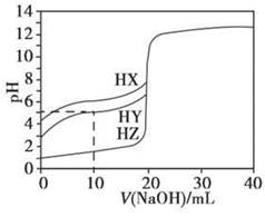 3、选择题 25℃时,用浓度为0.1000 mol·L-1的NaOH溶液滴定20.00 mL浓度均为0.1000 mol·L-1的三种酸HX、HY、HZ,滴定曲线如下图所示。下列说法正确的是