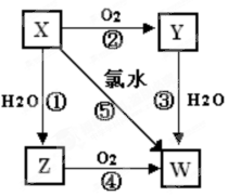 5、填空题 (9分)已知X气体是一种无色有刺激性气味的酸性氧化物,有关X、Y、Z、W的转化关系如下,反应①~④均为化合反应。回答下列问题: