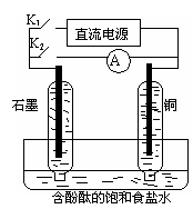 试题分析:A、实验时,先断开K2,闭合K1,两极均有气泡产生;电解饱和食盐水,铜不能作阳极,因此石墨作阳极,左边放出氯气,铜作阴极,右边放出氢气,溶液显碱性,2H2O+ 2Cl-