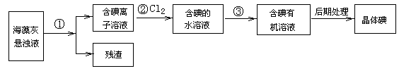 4、填空题 (10分)海藻中含有丰富的、以离子形式存在的碘元素.如图是实验室从海藻里提取碘的流程的一部分。