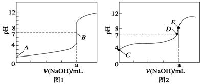 H2(g)+Br2(l)=2HBr(g) ΔH= 。 (2)常温下,将pH均为2的氢溴酸、乳酸(α—羟基丙酸)稀释100倍后,有一种酸的pH=4。请写出乳酸钠溶液中的水解离子方程式: 。 (3)常温下,用0.100 0 mol·L-1 NaOH溶液分别滴定20.00 mL 0.100 0 mol·L-1 HBr溶液和20.00 mL0.100 0 mol·L-1 CH3COOH溶液,得到2条滴定曲线,如图所示: ①根据图1和图2判断,滴定HBr溶液的曲线是 (填“图1”或“图2”); ②a= mL; ③c(Na+)=c(CH3COO-)的点是 点; ④E点对应溶 91exam .org液中离子浓度由大到小的顺序为 。