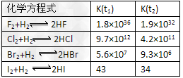 (4)在温度t1和t2下,X2(g)和H2反应生成HX的平衡常数如下表: