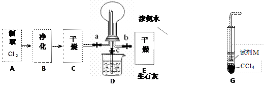 ②已知3Cl2 +2 NH3 =" 6HCl" + N2 ,当D的烧瓶中充满黄绿色气体后,关闭a、c打开b ,D中的现象为??????????????,反应一段时间后,关闭b打开c,观察到的现象为????;
