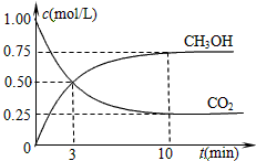 ②在一恒温恒容密闭容器中充入1 mol CO2和3 mol H2,进行上述反应。测得CO2和CH3OH(g)的浓度随时间变化如上图(右)所示。下列说法正确的是_________________(填字母代号)。
