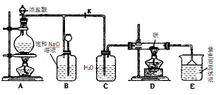 (2)实验开始先点燃A处的酒精灯,打开旋塞K,让Cl2充满整个装置,再点燃D处的酒精灯。 Cl2通过C瓶后进入D,D装置内盛有碳粉,发生氧化还原反应,生成CO2和HCl,写出D 装置中反应的化学方程式 ____________;装置C的作用是___________ 。