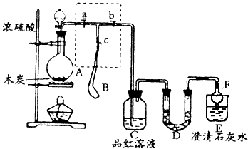 实验题 为检验浓硫酸与木炭在加热条件下反应产生SO2和CO2气体,设计了如下图所示实验装置,a、b、c为止水夹,B是用来源:91 考试网于储气的气囊,D中放有用I2和淀粉的蓝色溶液浸湿的脱脂棉,请回答下列问题: