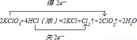 试题分析:(1)KClO3中氯元素化合价由+5价降低为ClO2中+4价,化合价降低1价;HCl中氯元素化合价由-1价升高为Cl2中0价,化合价升高2价,化合价升降最小公倍数为2,故ClO2系数为2,Cl2系数为1;所以KClO3系数为2,KCl系数为2,HCl系数为4,结合元素守恒,可知未知物是水,水的系数是2.电子转移的方向和数目为: