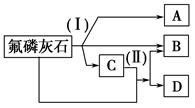 2、填空题 工业上常用氟磷灰石[Ca5(PO4)3F]为原料,按如下图所示流程制取磷酸、重过磷酸钙[Ca(H2PO4)2]和氢氟酸。图中反应(Ⅰ)为氟磷灰石跟另一种原料反应,生成A、B、C三种物质,其中的产物C又跟氟磷灰石发生反应(Ⅱ),生成B和重过磷酸钙。