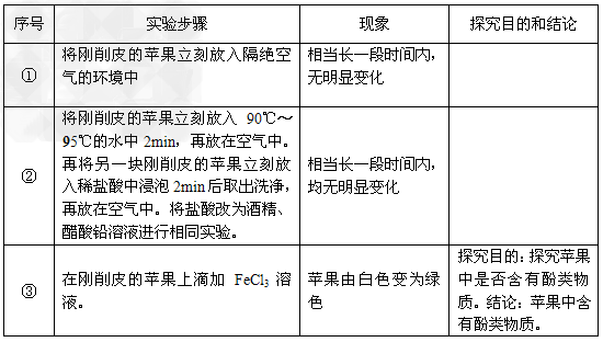 1、实验题 削过皮的苹果过一段时间后颜色就会由白色变为褐色,食品科学上称为“褐变”。某研究性学习小组查阅有关资料,发现不同文献解释不同。