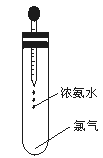 3、填空题 (6分)如图所示,试管中集满干燥的氯气,胶头滴管中装有供反应的足量浓氨水.滴入浓氨水,开始时试管内发生的反应有氧化还原反应:NH3+Cl2→N2+HCl并产生红光和白烟。