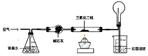 下图是模拟工业制硝酸原理的实验装置。先用酒精灯对硬质玻璃管里的三氧化二铬加热,然后把空气鼓入盛有浓氨水的锥形瓶,当三氧化二铬保持红热状态时,移去酒精灯。根据题意回答:
