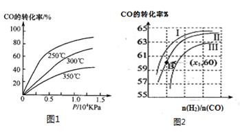 ①CO在不同温度下的平衡转化率与压强的关系如图1所示,该反应ΔH?????0(填“>”或“ <”)。 图2表示CO的转化率与起始投料比[ n(H2)/n(CO)]、温度的变化关系,曲线I、II、III对应的平衡常数分别为K1、K2、K3,则K1、K2、K3的大小关系为?????????;测得B(X1,60)点氢气的转化率为40%,则x1=????????。 ②在恒容密闭容器里按体积比为1:2充入一氧化碳和氢气,一定条件下反应达到平衡状态。当改变反应的某一个条件后,下列变化能说明平衡一定向正反应方向移动的是??????(填序号)。