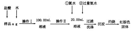 (4)灼烧后得到的固体为Fe2O3,质量为W2-W1,可算出Fe元素的质量为:112(W2-W1)/160,因为原样品配制了100.00ml溶液,从中取出了20.00ml进行的实验,所以乘以5得原样品中铁元素的质量,进而求出质量分数。