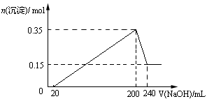 试题分析:根据图像可知,加入氢氧化钠溶液后并没有立即生成沉淀,这说明稀硫酸是过量的,所以应该有关的方程式是H++OH-=H2O、Al3++3OH-=Al(OH)3↓、Mg2++2OH-=Mg(OH)2↓、Al(OH)3+OH-=AlO2-+2H2O。根据图像可知,和氢氧化铝反应的氢氧化钠溶液是240ml-200ml=40ml,则氢氧化铝的物质的量是0.35mol-0.15mol=0.20mol,氢氧化镁是0.15mol,所以根据原子守恒可知,镁和铝的总的质量是0.15mol×24g/mol+0.2