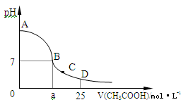 4、填空题 (4分)在25mL 0.1 mol·L-1的NaOH溶液中逐滴加入0.2 mol·L-1的CH3COOH溶液,溶液pH变化曲线如图所示。