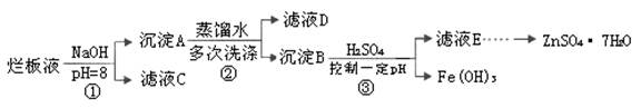 5、填空题 制备锌印刷电路板是用稀硝酸腐蚀锌板,产生的废液称“烂板液”。“烂板液”中含硝酸锌外,还含有自来水带入的Cl—和Fe3+。在实验室里,用“烂板液”制取ZnSO4·7H2O的过程如下: