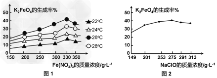(3)反应的温度、原料的浓度和配比对高铁酸钾的产率都有影响。 图1为不同的温度下,Fe(NO3)3不同质量浓度对K2FeO4生成率的影响; 图2为一定温度下,Fe(NO3)3质量浓度最佳时,NaClO浓度对K2FeO4生成率的影响。