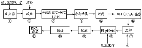 5、实验题 碘酸钾是一种白色结晶粉末,无臭无味,酸性条件下碘酸钾是一种较强的氧化剂,与氢碘酸、二氧化硫等还原性物质作用,被还原为单质碘,在碱性介质中,碘酸钾能被氯气、次氯酸盐等氧化为高碘酸钾。碘酸钾在常温下稳定,加热至560℃开始分解。工业生产碘酸钾的流程如下,在反应器中发生反应的化学方程式为:I2+KClO3+H2O→KH(IO3)2+KCl+Cl2(未配平)