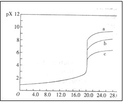3、选择题 已知25℃时,AgC1、AgBr、Agl的Ksp分别为1.8×l0-l0、5.O×10—13、8.3×10—17,用AgNO3标准溶液滴定卤素离子的过程,以滴入AgNO3溶液的体积为横坐标,pX为纵坐标:[pX= -lgc(X