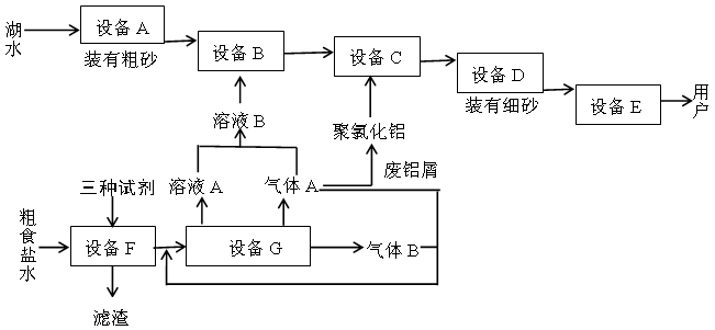 (2)根据流程图可知,设备C是净水的,因此设备B是消毒的,其中能由于消毒的是二氧化氯,其中a是明矾,作为净水剂,臭氧和重铬酸钾具有氧化性,一般不能用于水的消毒,活性炭具有吸附性,答案选b。