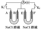 (3)若往U型管中滴加酚酞,进行(1)、(2)操作时,?极周围能变红(填A、B、E、或F)。