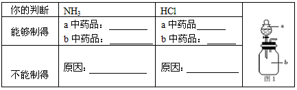 5、实验题 某化学兴趣小组欲制取氨气和氯化氢气体并完成喷泉实验(图中夹持装置均已略去)。 (1)写出实验室制取氨气的化学方程式:___________________________。 (2)若实验室只有浓硫酸、浓盐酸、浓氨水、氢氧化钠固体、氯化铵固体、氧化钙、无水氯化钙、石蕊试液和如图1所示气体发生装置,你认为他们能制得所需的气体吗?把你的判断填入下表