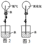 (3)如果用图2装置进行喷泉实验,上部烧瓶已装满干燥氨气,打开止水夹,挤出胶头滴管中的水引发水上喷。该实验的原理是________________________。 (4)如果用图3装置进行喷泉实验,上部烧瓶已装满干燥氯化氢气体,请说明引发喷泉的方法。______________________________。 (5)若至喷泉实验停止图,图2中剩有烧瓶容积1/5的气体;图3烧瓶中剩有烧瓶容积1/4的气体;则图3烧瓶中盐酸的物质的量浓度为____________(两种气体均在标准状况下收集);图2烧瓶中氨水的物质的量浓度___________(填“大于”、“小于”、“等于”)图3烧瓶中盐酸的物质的量浓度。 (6)若取上述两种溶液等体积混合,溶液中离子浓度由大到小的顺序为______________若使上述两种溶液混合后,溶液中NH4+离子浓度等于Cl-离子浓度应如何操作:_________________________________。