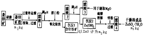 1、填空题 硫酸锌可作为食品锌强化剂的原料。工业上常用菱锌矿生产硫酸锌,菱锌矿的主要成分是ZnCO3,并含少量的Fe2O3、FeCO3、MgO、CuO等,生产工艺流程示意如下: