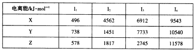 ②X、Y和Z为第三周期元素,其原子的第一至第四电离能如下表:
