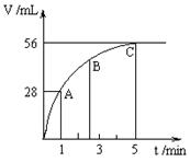 5、填空题 (8分)在50mLH2O2水溶液中加入2g二氧化锰,在标准状况下放出气体的体积与时间的关系如图所示: