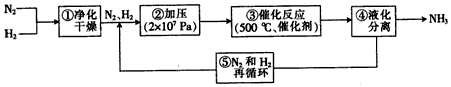 5、选择题  1913年德国化学家哈伯发明了以低成本制造大量氨的方法,从而大大满足了当时日益增长的人口对粮食的需求。下列是哈伯法的流程图,其中为提高原料转化率而采取的措施是