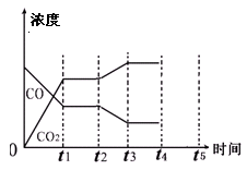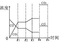 (4)由图像可知t2时刻CO浓度减小,CO2浓度增大,因此改变的条件是降低温度,或增加水蒸汽的量。t4时刻通过改变容积的方法将压强增大为原先的两倍,平衡不移动,但物质的浓度均增大,都变为原来大2倍,如图所示: